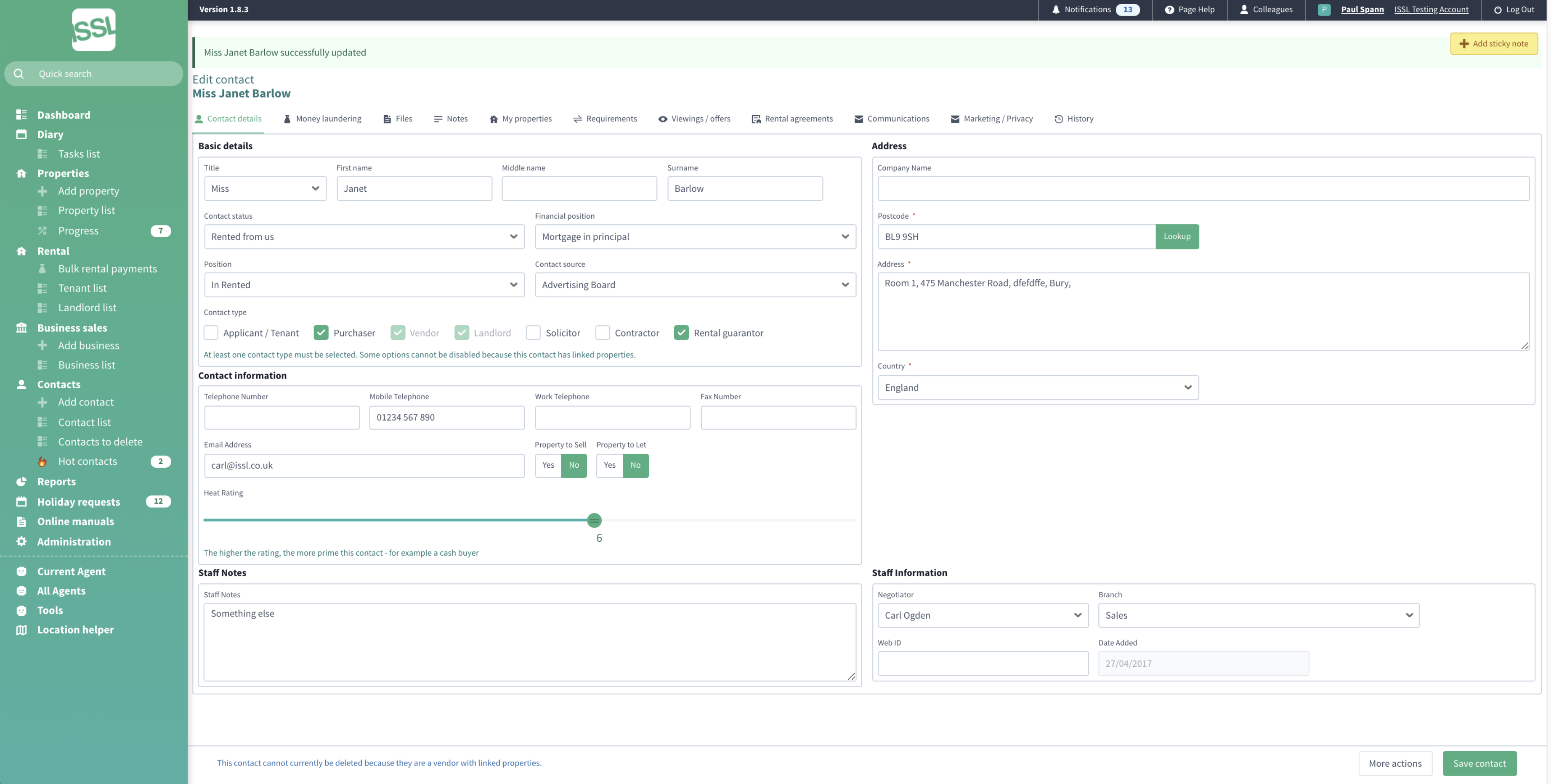 As you would expect, Standout Property Manager has a comprehensive data entry system for storing contacts. As well as being able to store name and address, Standout Property Manager has the ability to store Applicants/Tenants, Vendors, Landlords, Solicitors, Contractors and Rent Guarantors. The ability to contact by both email and SMS.