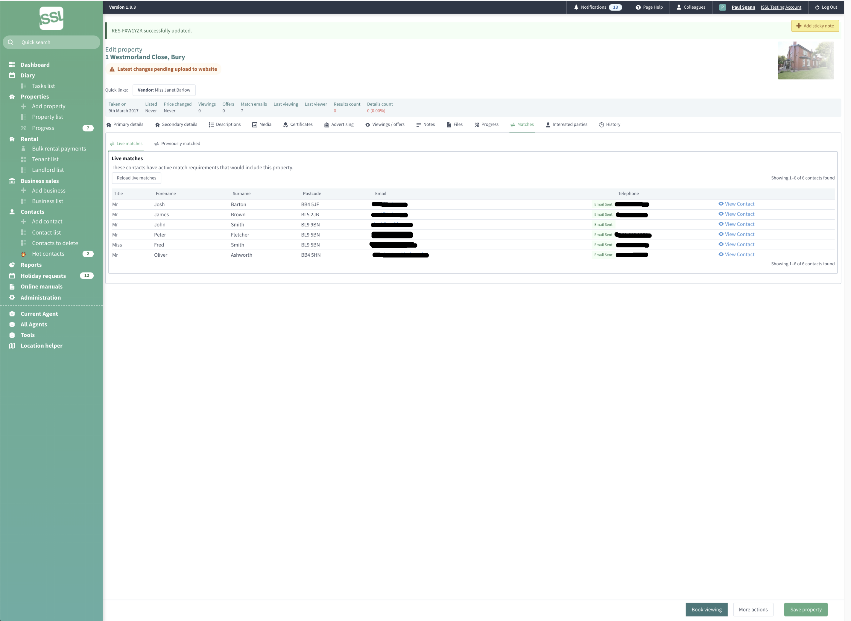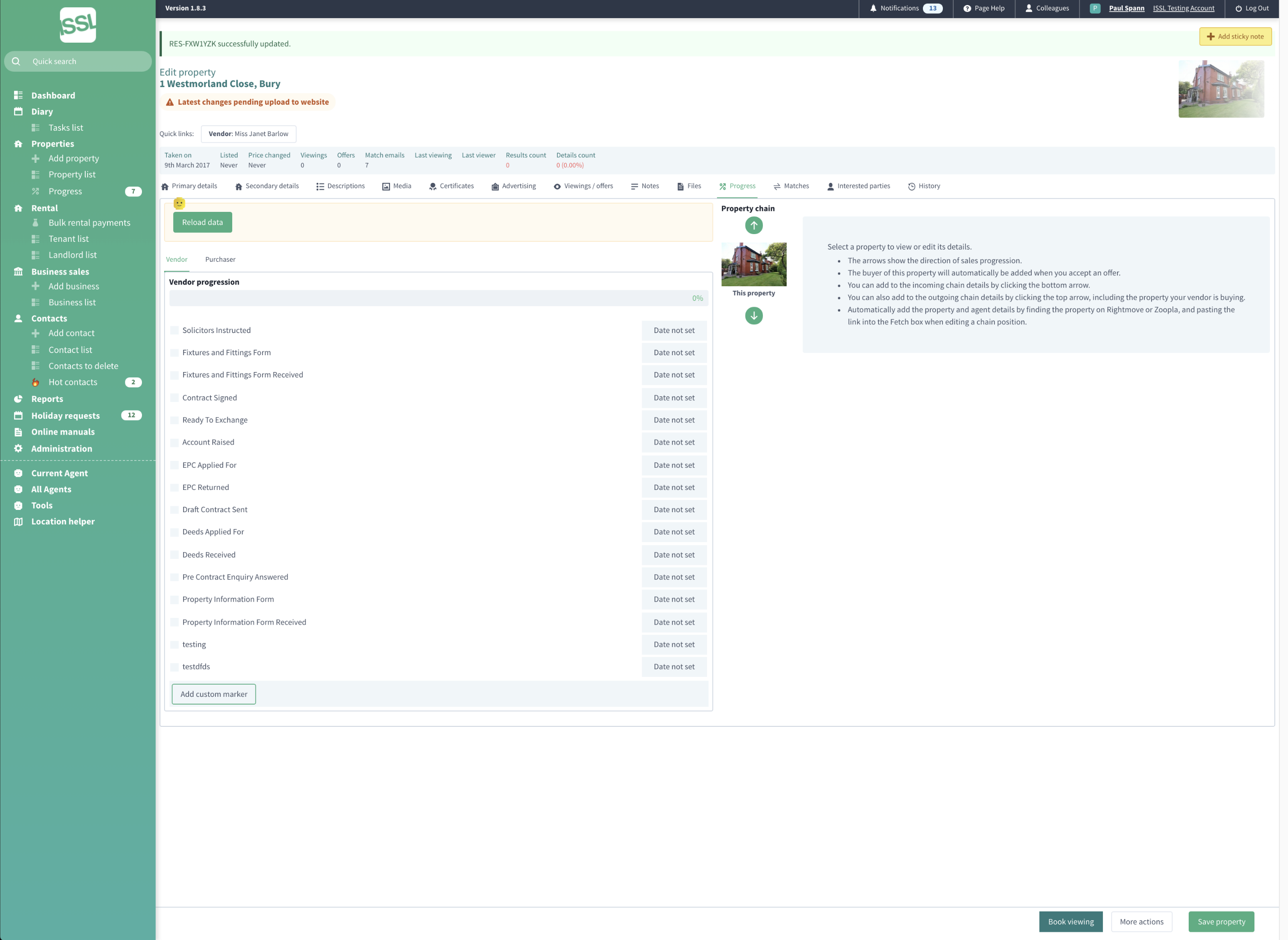 Store detailed rental information such as certificates, repairs, service appointments, rent reviews. Automate advertising board requests. Manage viewings and offers from potiental buyers, including sending letters by post or email.